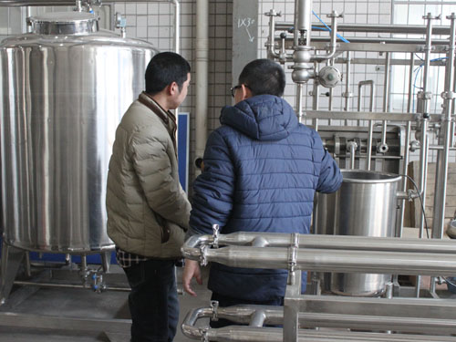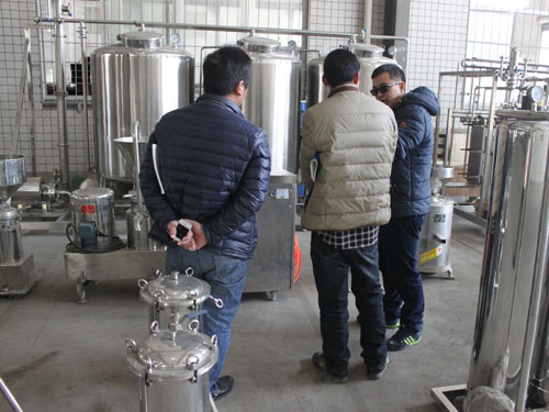2015年3月2日,河南客戶自主創(chuàng)業(yè)需要采購(gòu)一套豆?jié){生產(chǎn)線設(shè)備,來我公司考察并與業(yè)務(wù)員進(jìn)行具體需求的洽談。下圖為業(yè)務(wù)員向客戶講解工廠設(shè)備:
